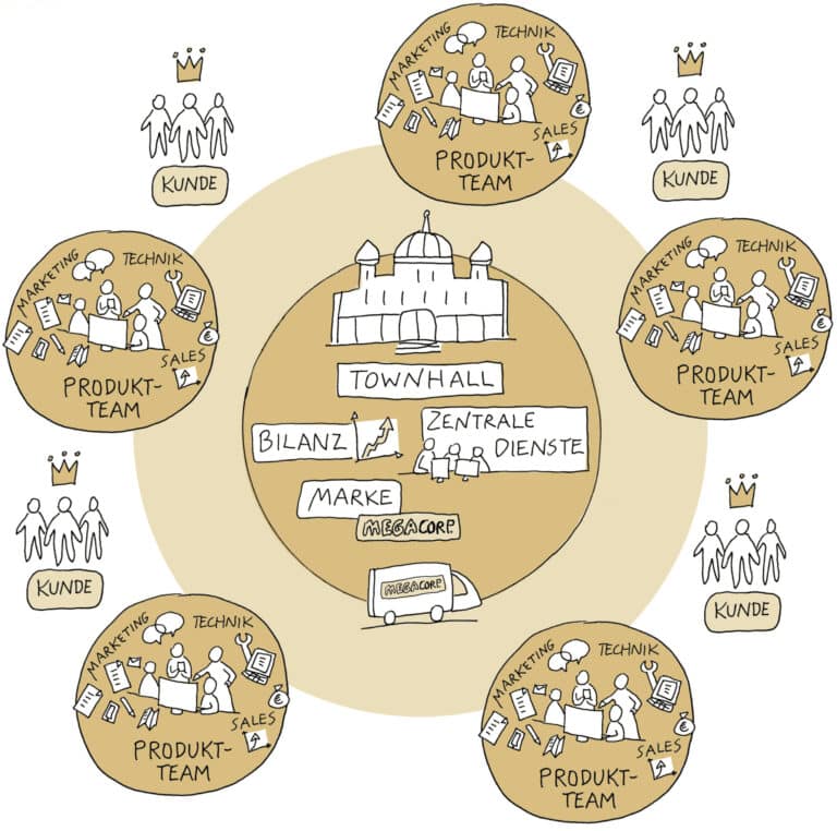 Die Ausnahme bilden allerdings in bestimmten Fällen das Top-Management und manche zentralen Dienstleistungen. Die Geschäftsführung und das Management sind für die strategische Ausrichtung des Unternehmens zuständig, während sich zentrale Dienstleistungen übergreifend um ihr Themenfeld kümmern. Dieses unterscheidet sich je nach Branche oder Arbeitsart. Ein Beispiel wäre die zentrale Buchhaltung für das gesamte Unternehmen. Die anderen Ableitungen aber sind bis zu einem gewissen Grad durchlässig und flexibel gestaltet. Es ist so nicht mehr wichtig, zu welcher Abteilung jemand gehört, sondern wie die Tätigkeit, die Dienstleistung oder das Produkt am besten unterstützt werden kann. Zudem sind die Mitarbeiter*innen nicht über Jahrzehnte einer bestimmten Abteilung zugehörig, sondern die Strukturen sind temporär Natur und richten sich nach dem Markt und dem Produkt.